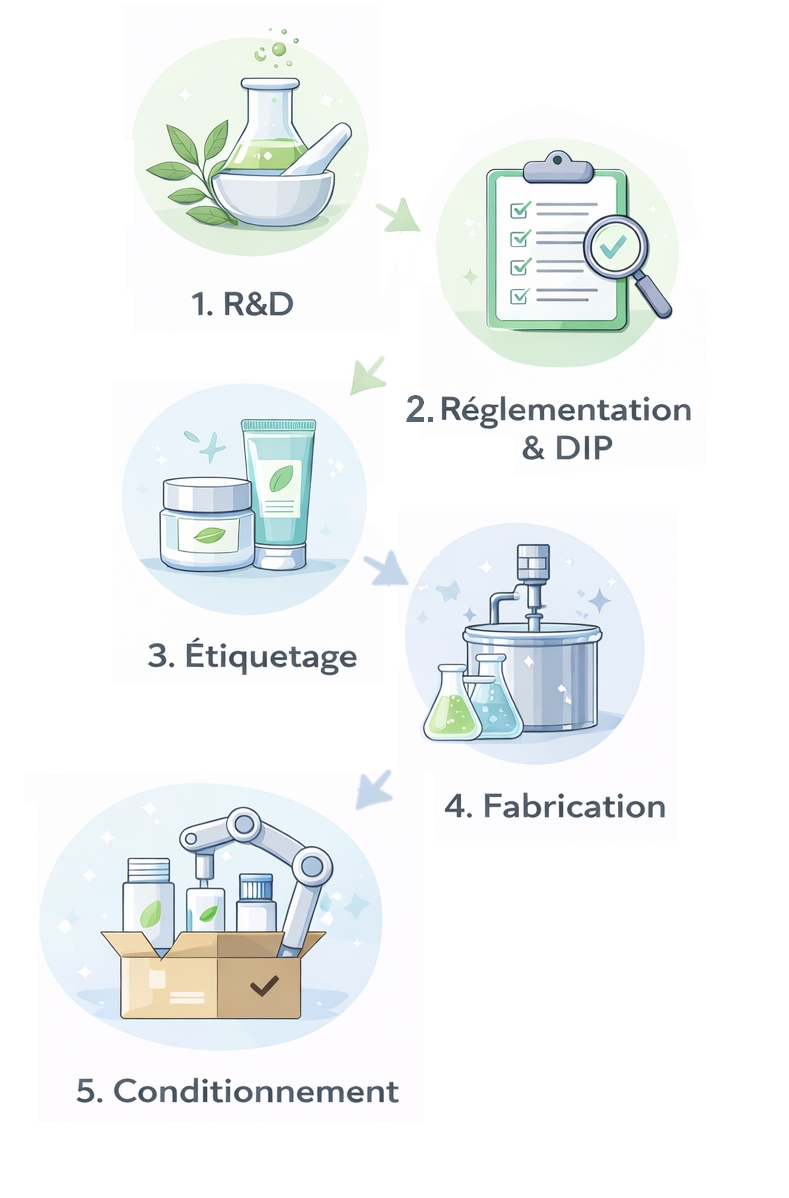 Vous apportez votre vision, votre marque, vos valeurs. Nous gérons tout le reste de la formulation à la livraison en passant par les tests et la réglementation.